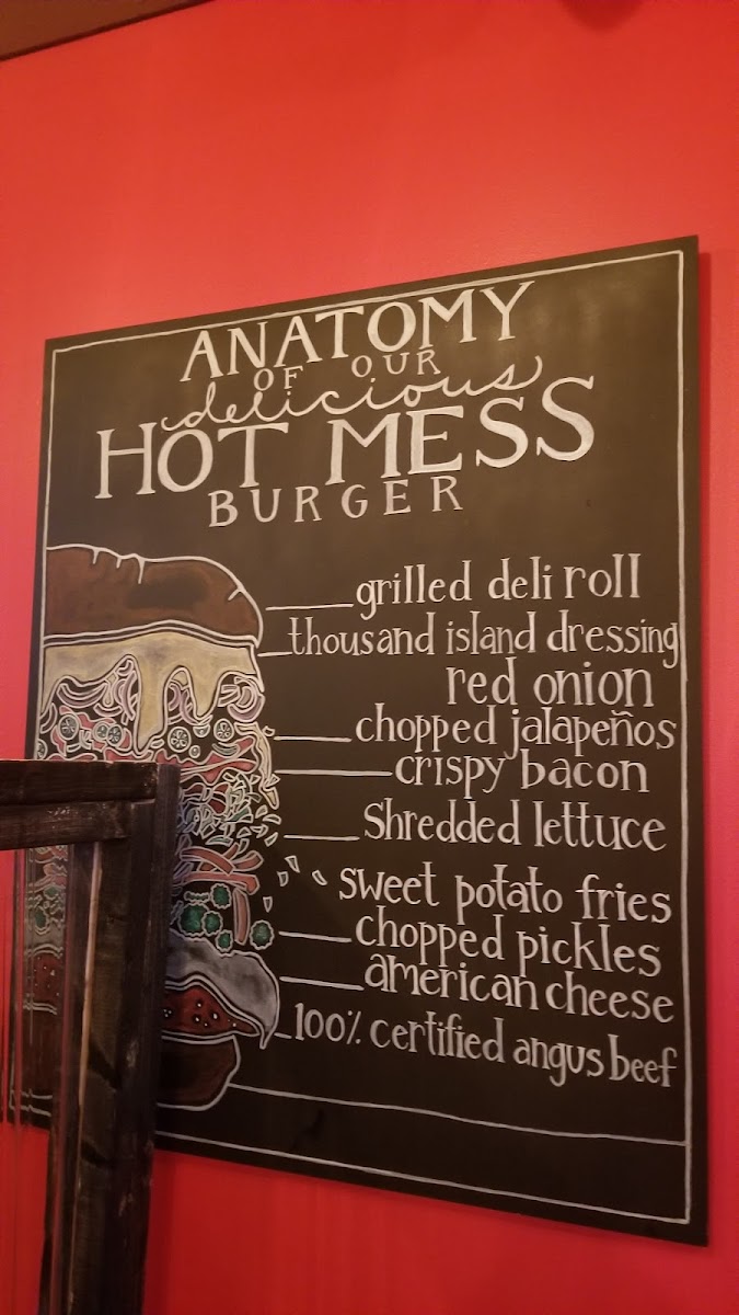 mumbo fried chicken, hot mess sauce with bacon, lettuce, pickles, mayo